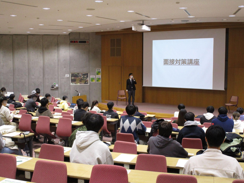 キャリア支援センターの仕事は学生向けと企業様向けの二軸があります。まず学生向けには就活ガイダンスの実施が挙げられます。就活のスケジュールについて解説したり、書類選考や面接対策といった対策をお手伝いしています。