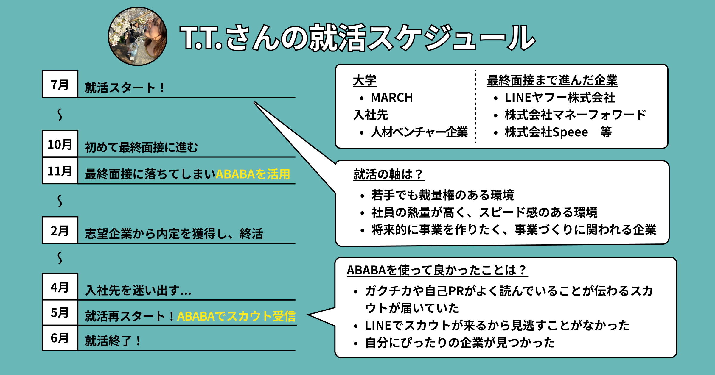 一度は軸に合った企業から内定を得たものの、違和感を大切にし再スタートされたT.T.さん。その中でABABAが理想の企業との出会いに繋がったとのことで、私たちもとても嬉しく思います。