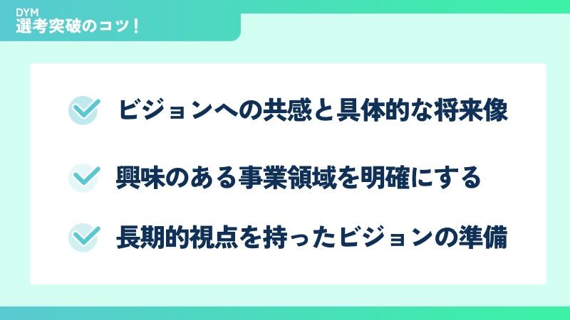 DYMの本選考を突破するために最も重要なのは、企業のビジョンへの共感と具体的な将来像を描くことです。「世界で一番社会を変える会社を創る」というビジョンに対して、なぜ共感するのか、自分はどのような形で貢献したいのかを具体的に語ることが求められます。